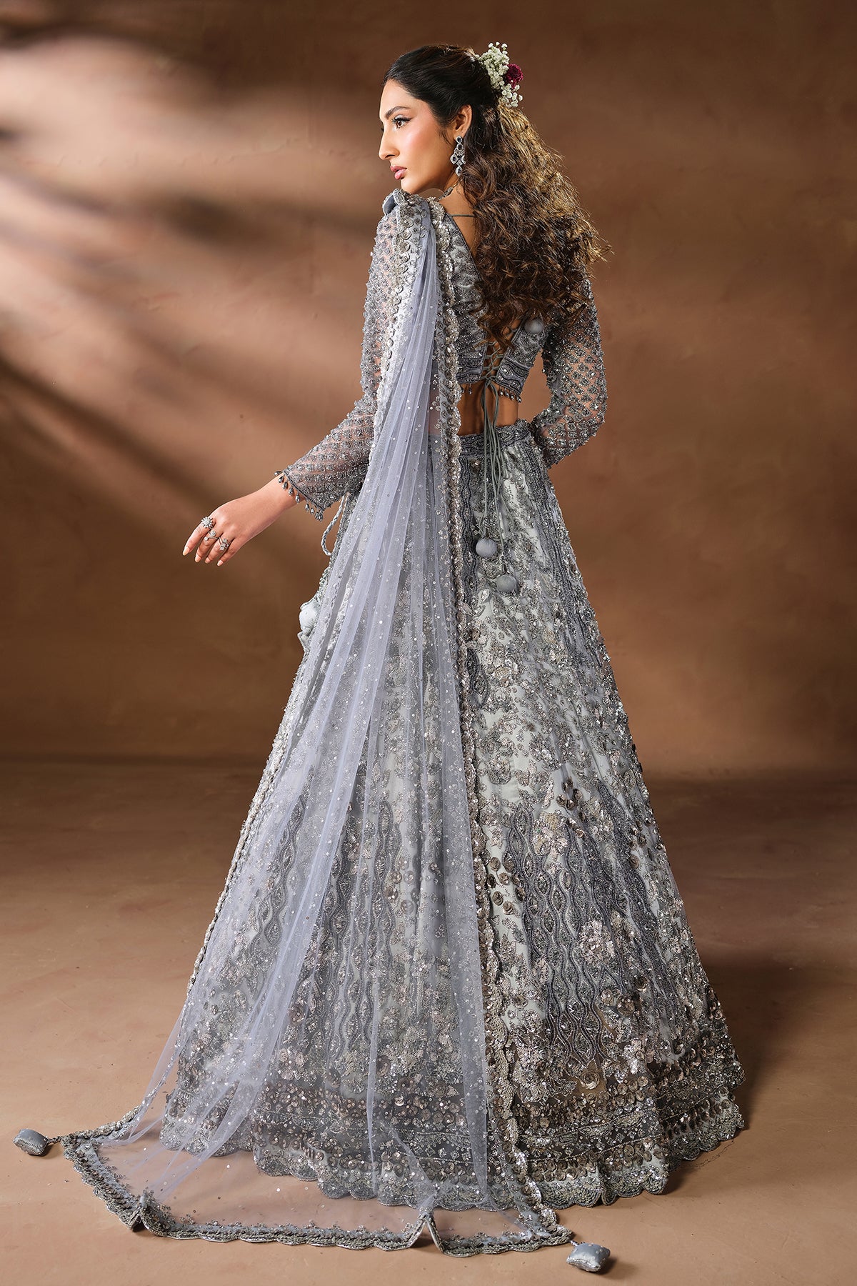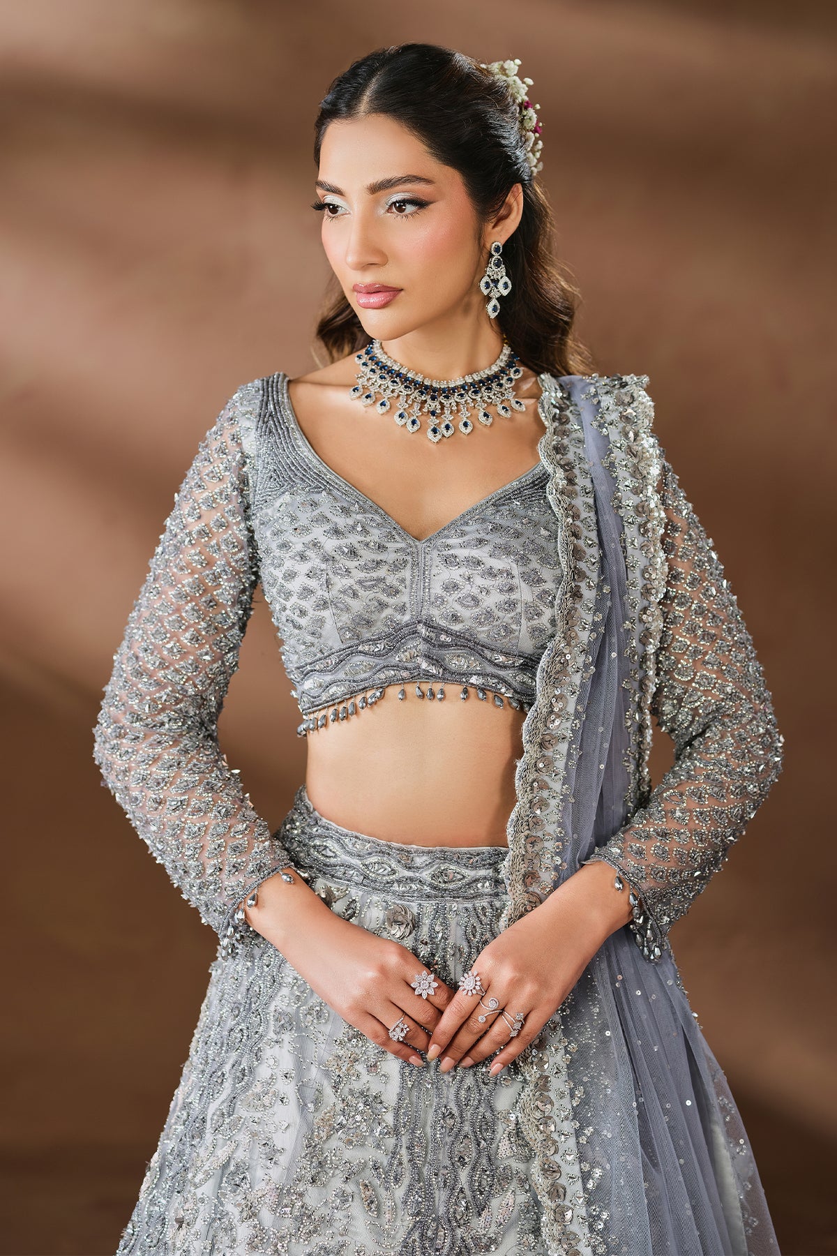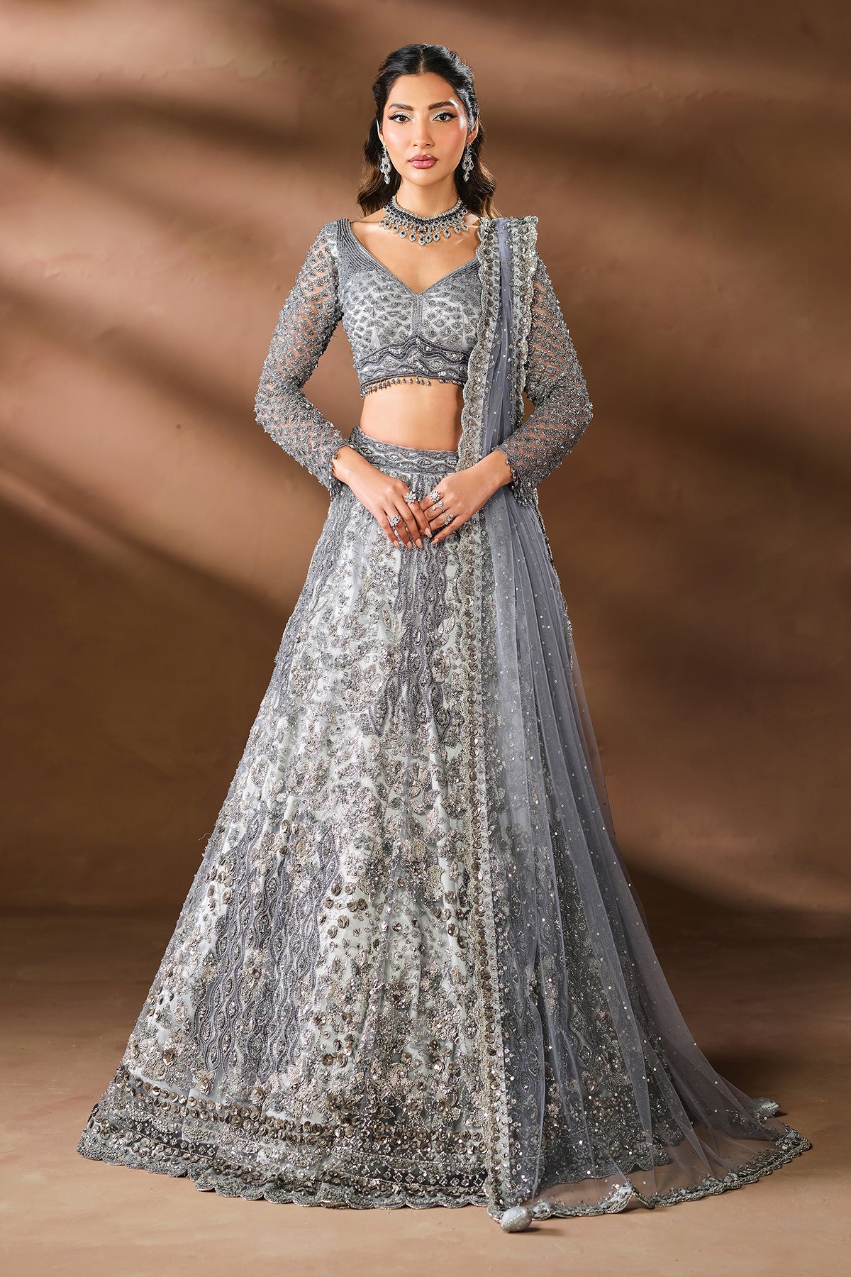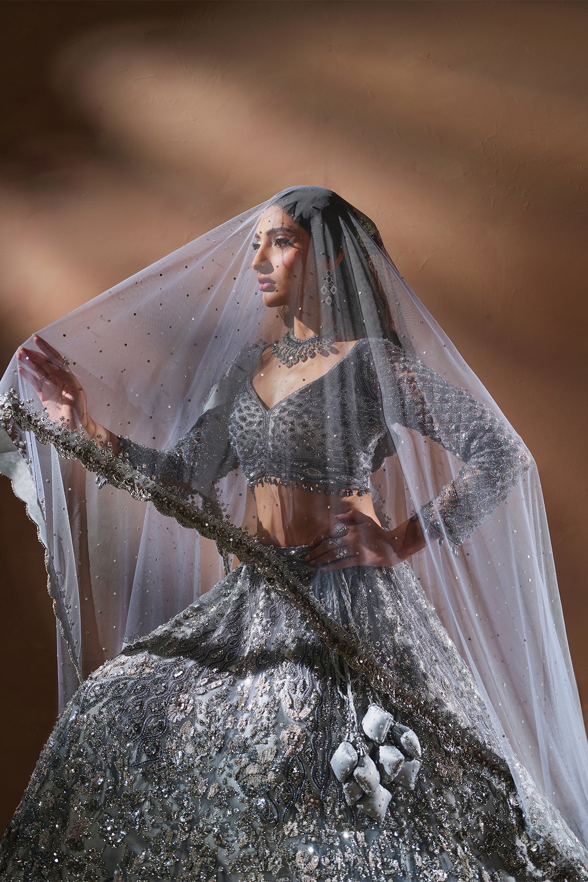 The stunning ensemble is rendered in rich silver and dusty grey tones, layered with intricate sequins, cut dana, micro-beads, and delicate threadwork. The choli features dense handwork that mirrors the grandeur of the lehenga, where ornate floral and geometric motifs and scalloped borders flow with a regal, shimmering rhythm. The sheer net dupatta drapes beautifully with scattered embellishments and fine borders, adding movement and softness. A look that captures modern opulence and exquisite craftsmanship from every angle!