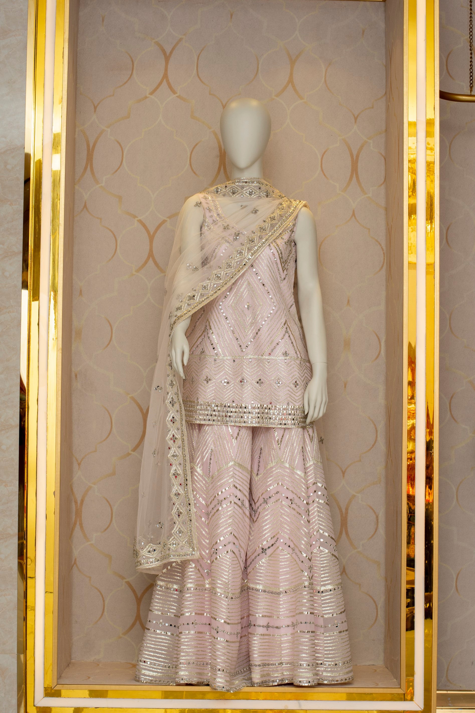 Delicate mirror embroidered details on the soft pink canvas including hand embroidered sheesha goti net in sequence on organza. The bodice features a heavily crafted geometric pattern paired up with a net dupatta to complete the look