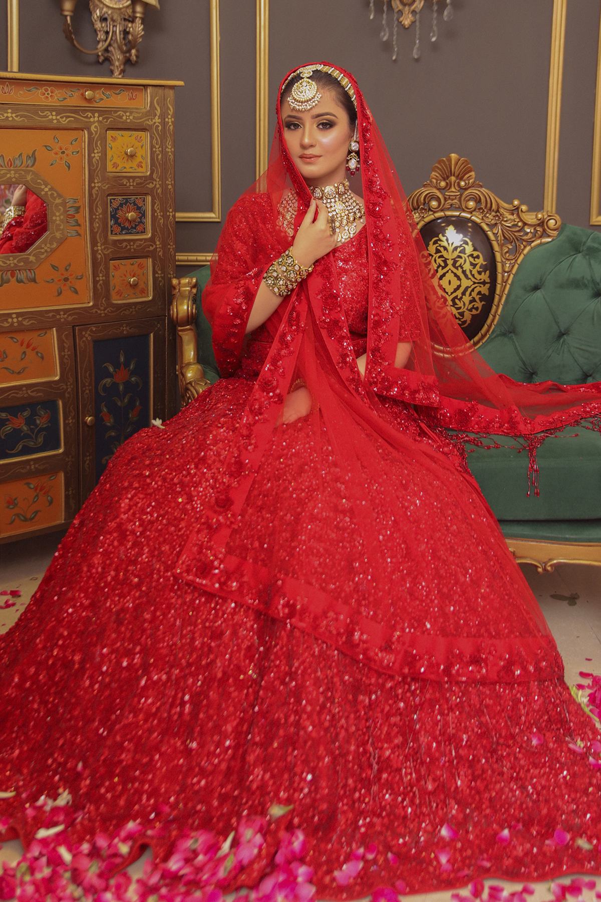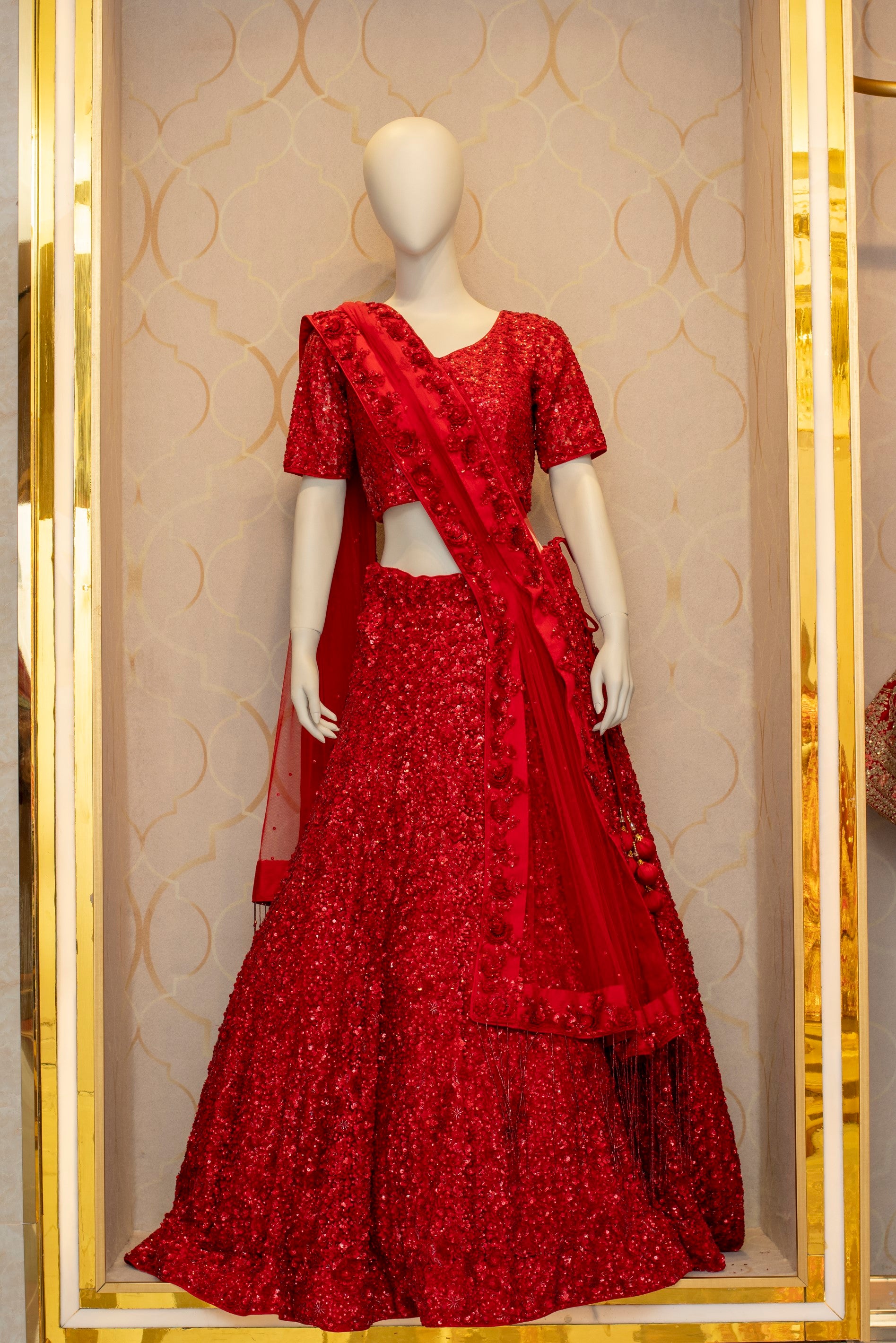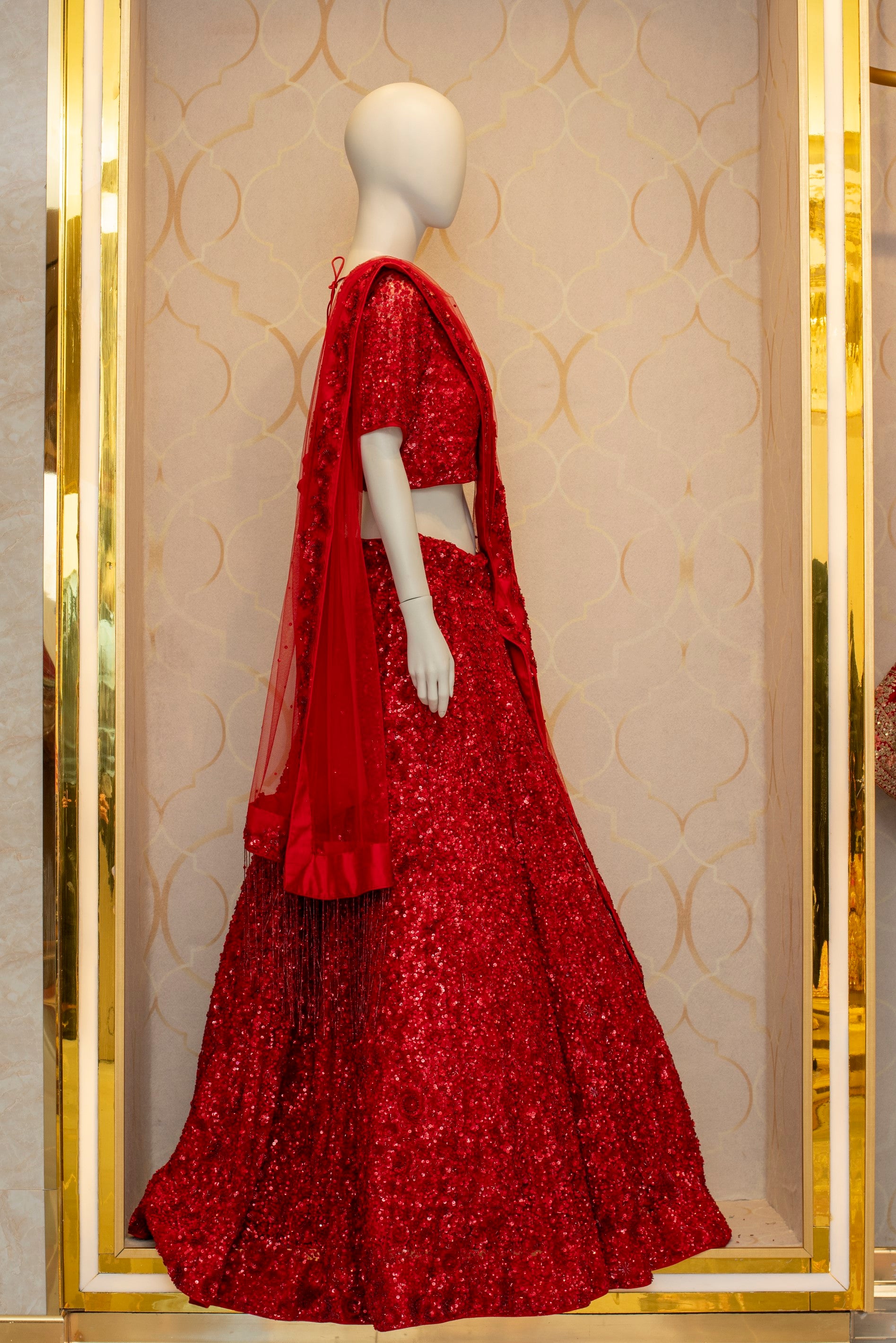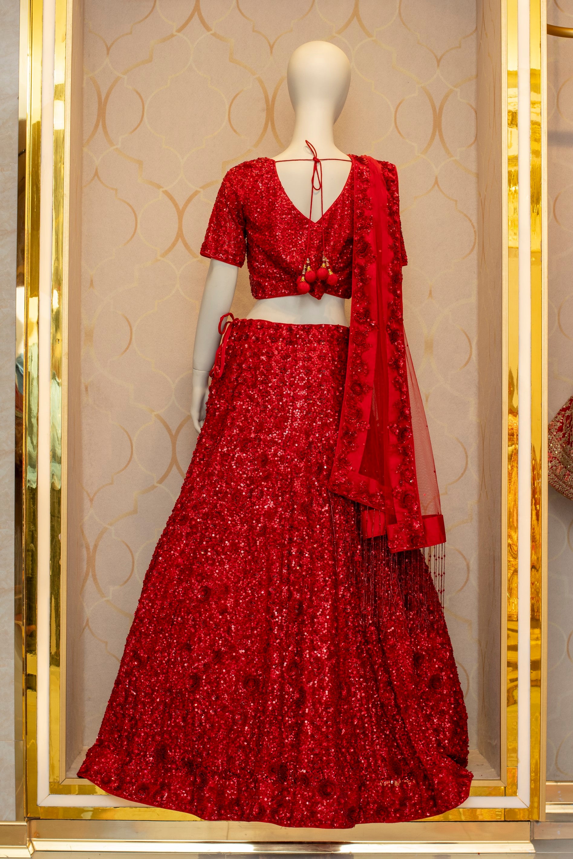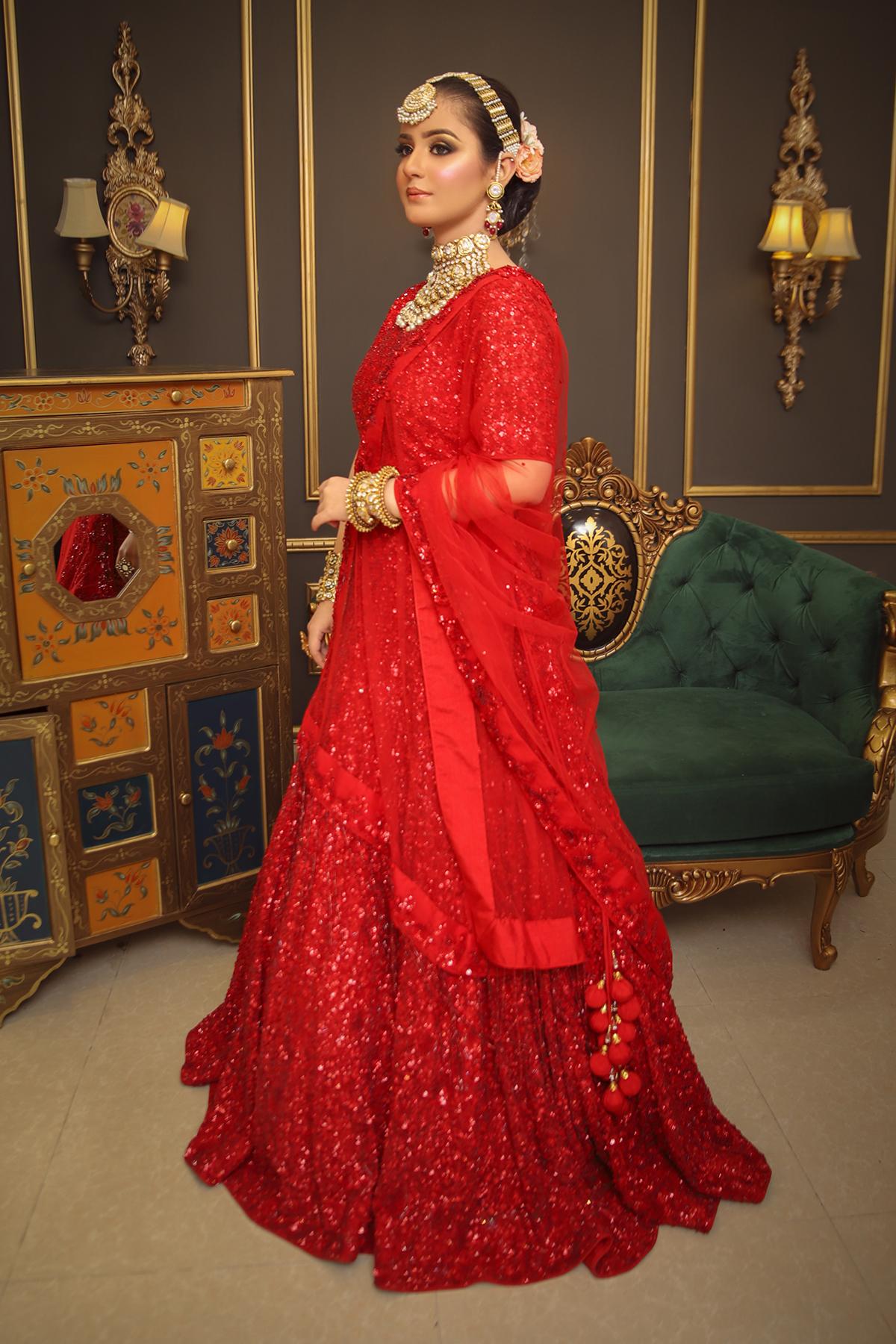 This luscious formal outfit is rendered in a beautiful shade of red canvas for the lehenga and choli. The timeless look is completed with a net dupatta layered with spray work making it a stellar piece.