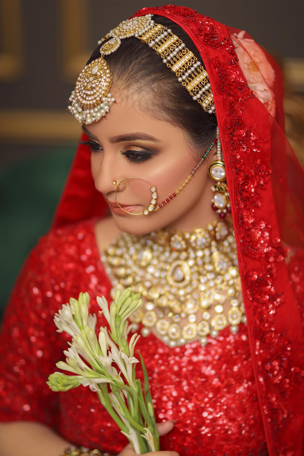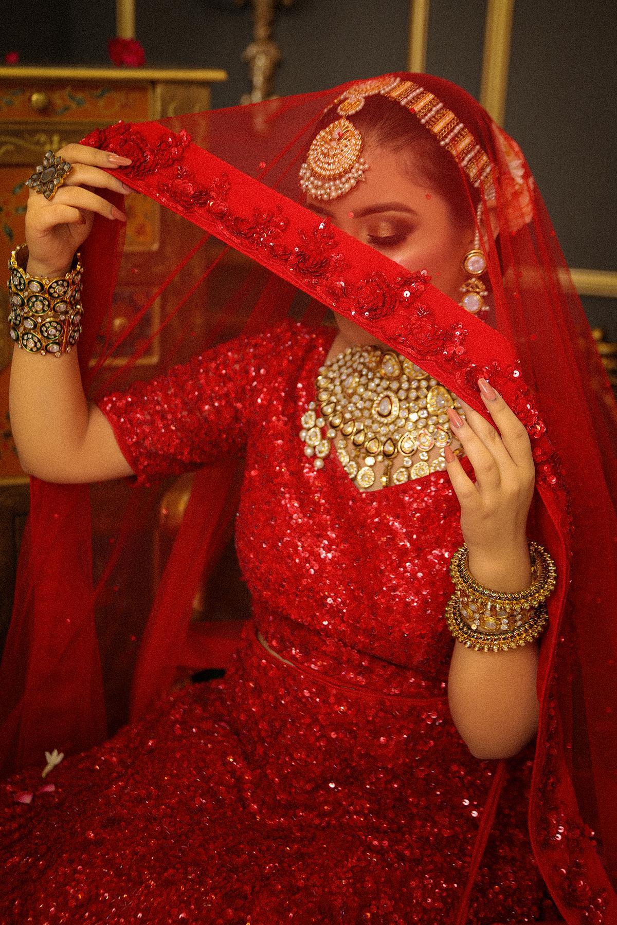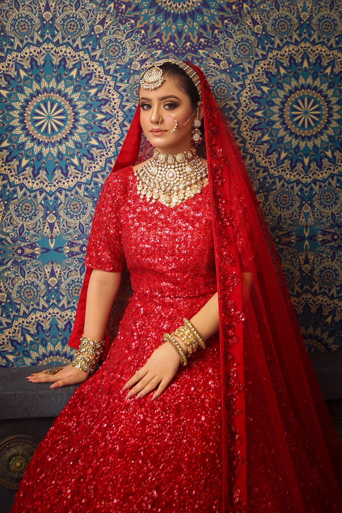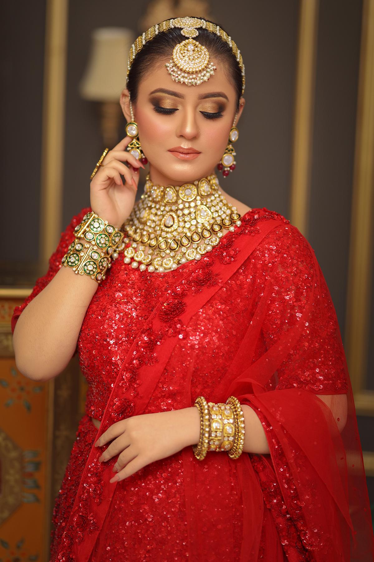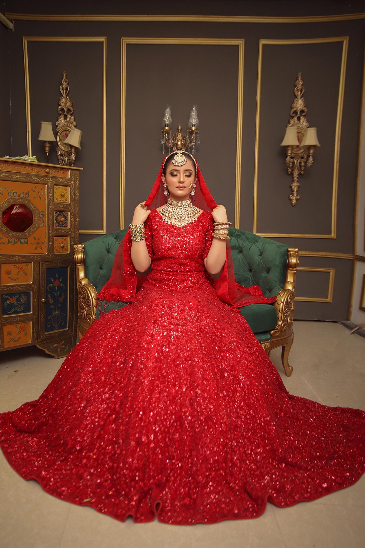 This luscious formal outfit is rendered in a beautiful shade of red canvas for the lehenga and choli. The timeless look is completed with a net dupatta layered with spray work making it a stellar piece.