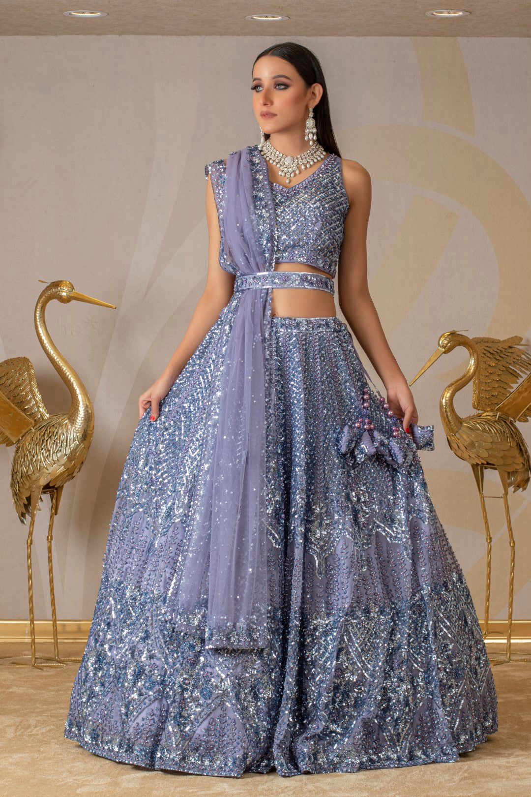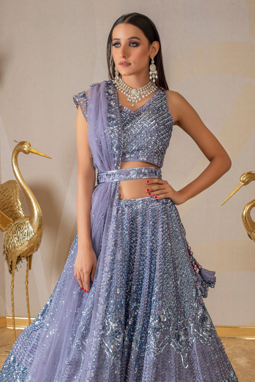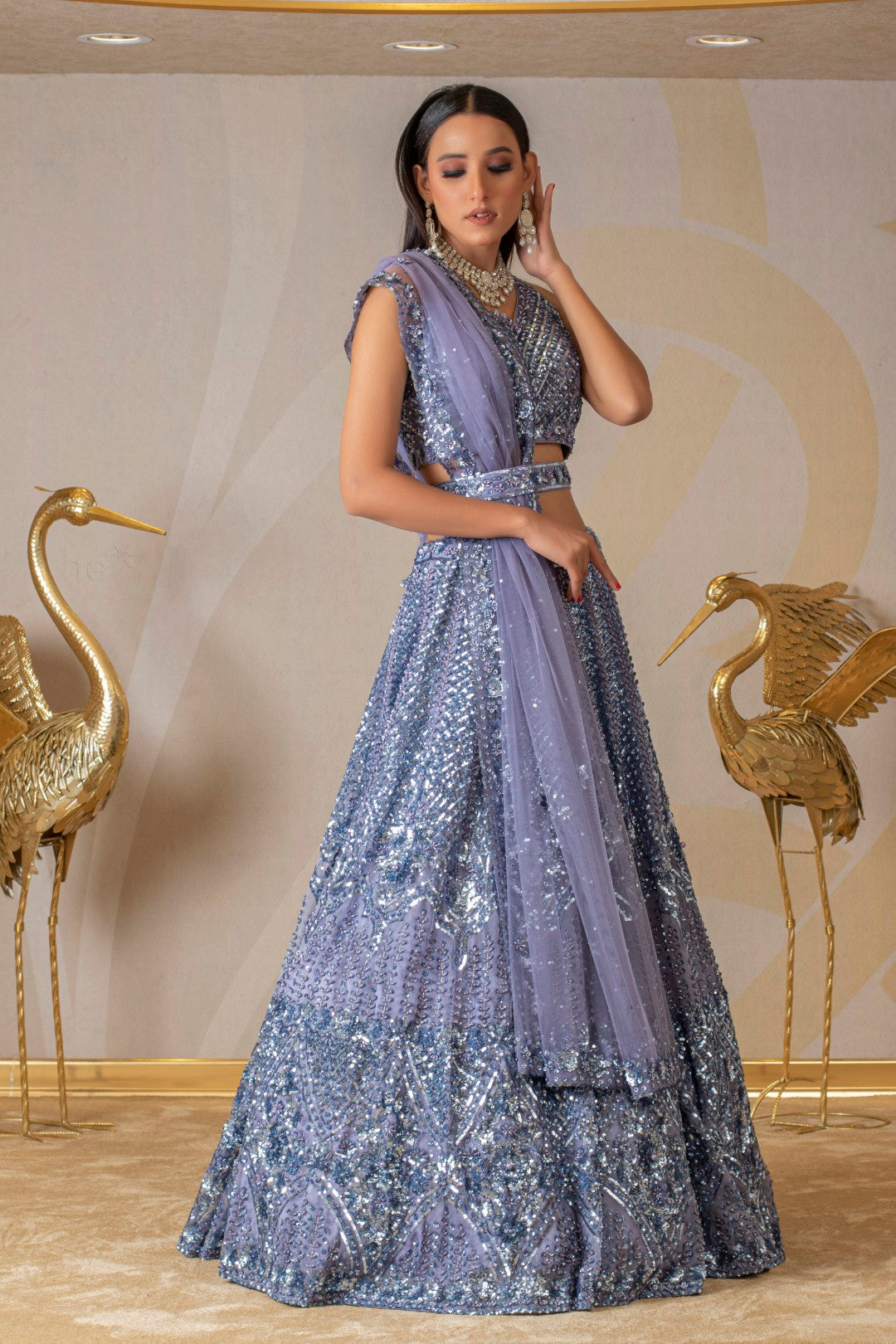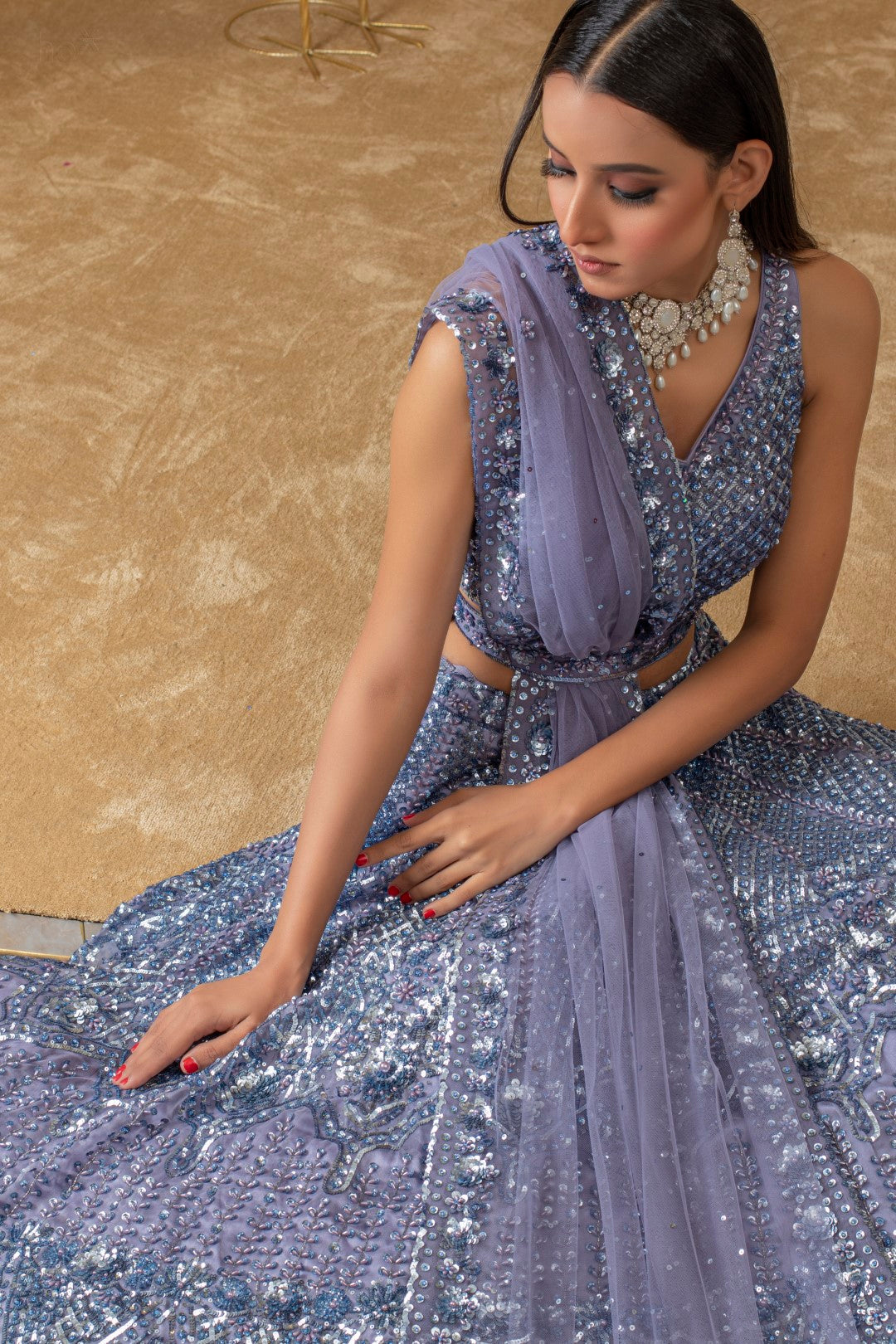 A magnificent lehnga choli is deliciously rendered in lilac hues featuring stones, sequins, and beads on organza. Lavishly scattered embellishments create this illuminating outfit ideal for the wedding season. The look is completed with a net dupatta featuring a spread of beads.