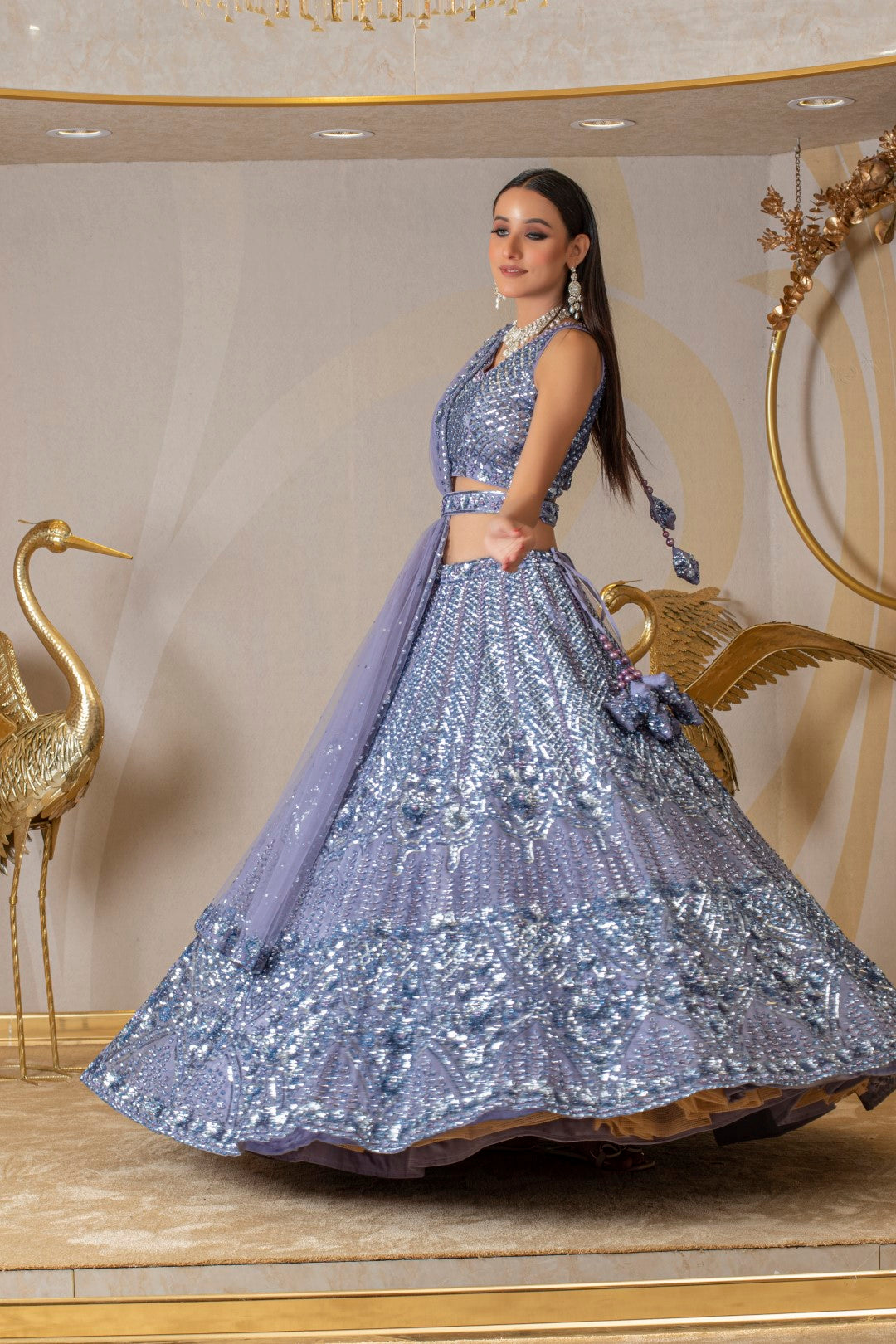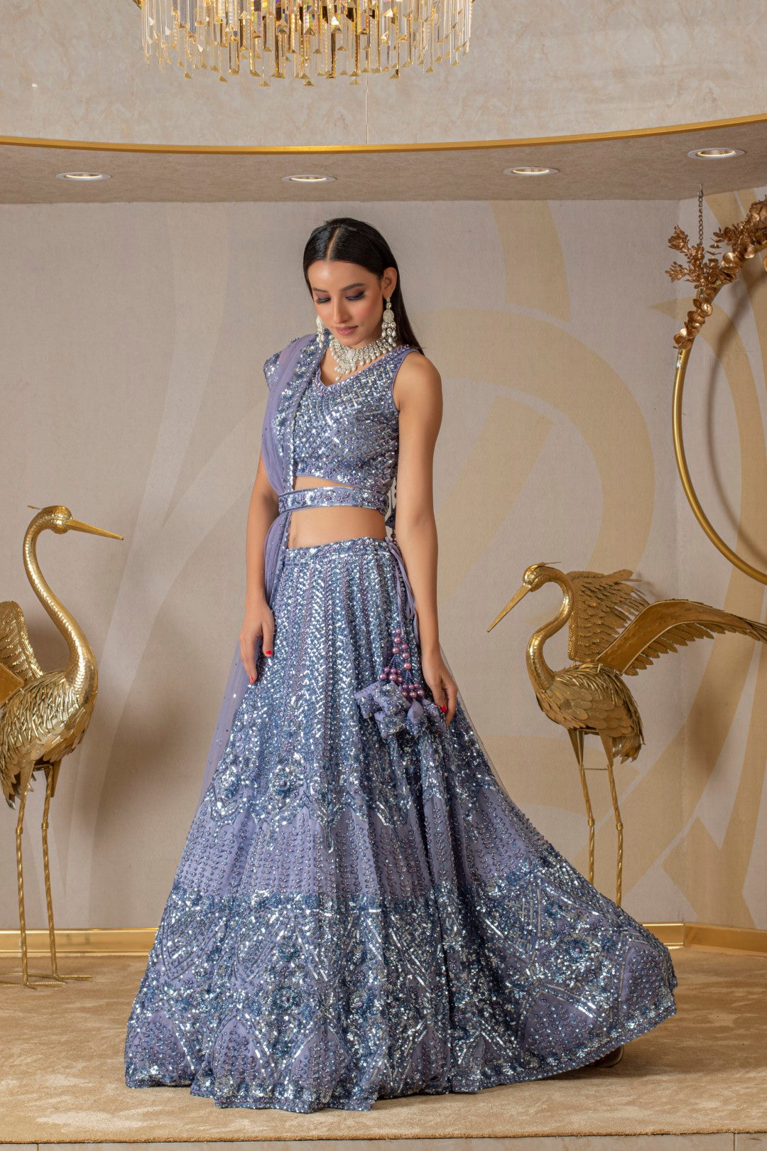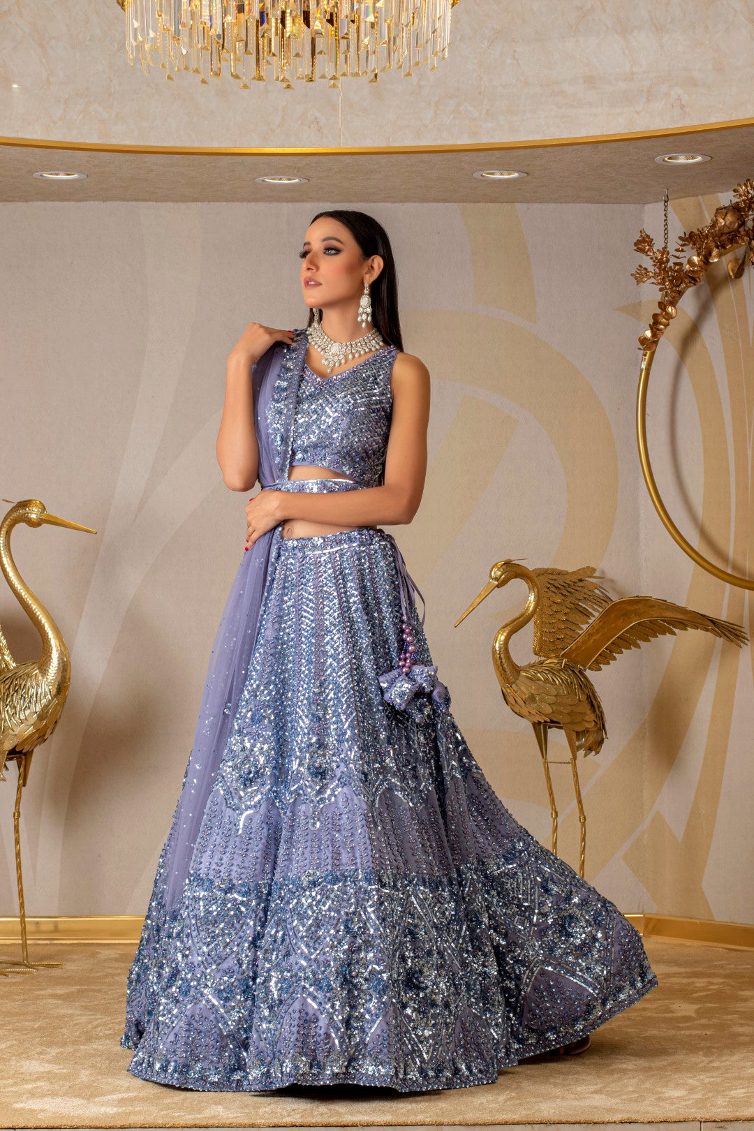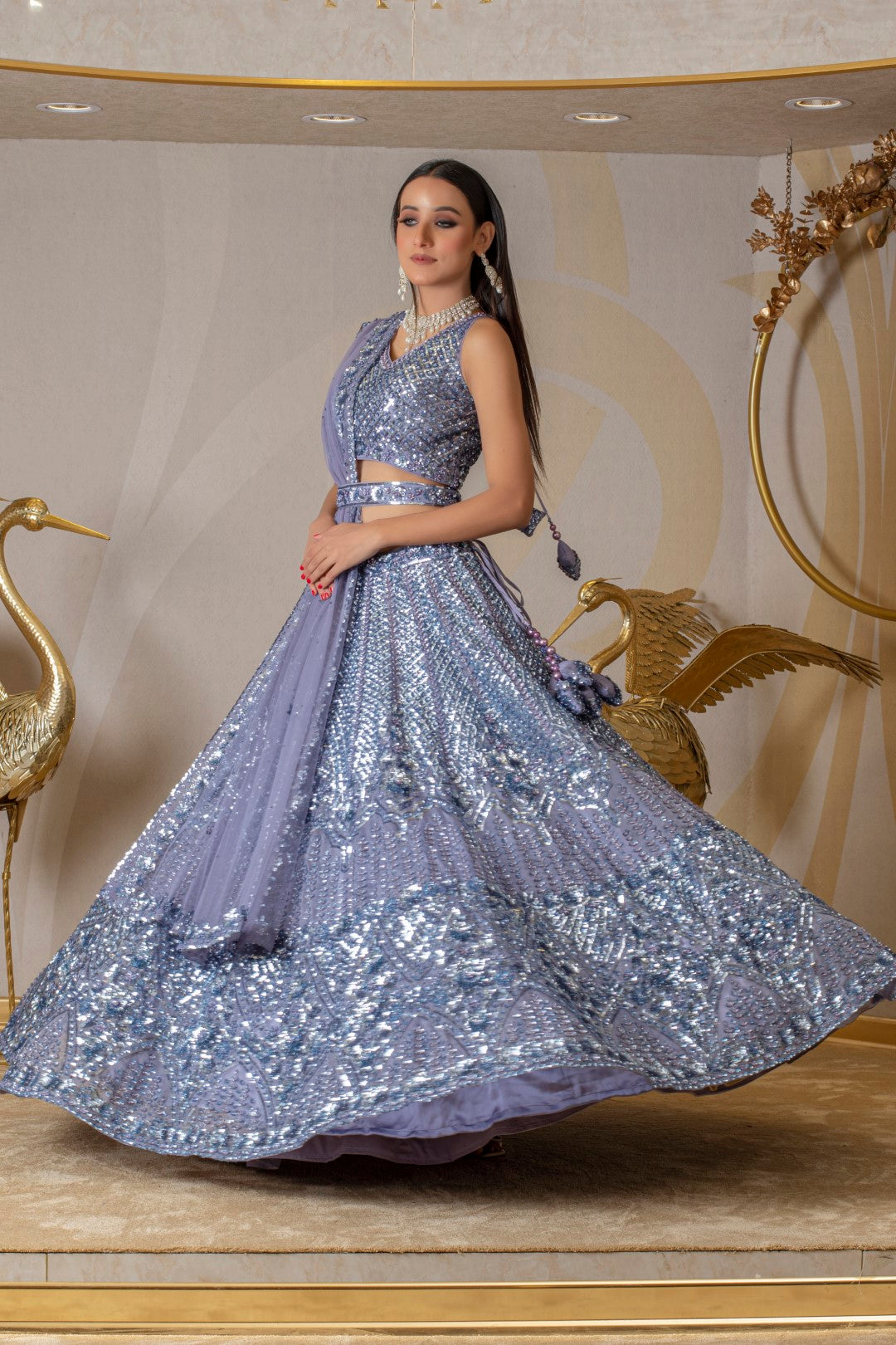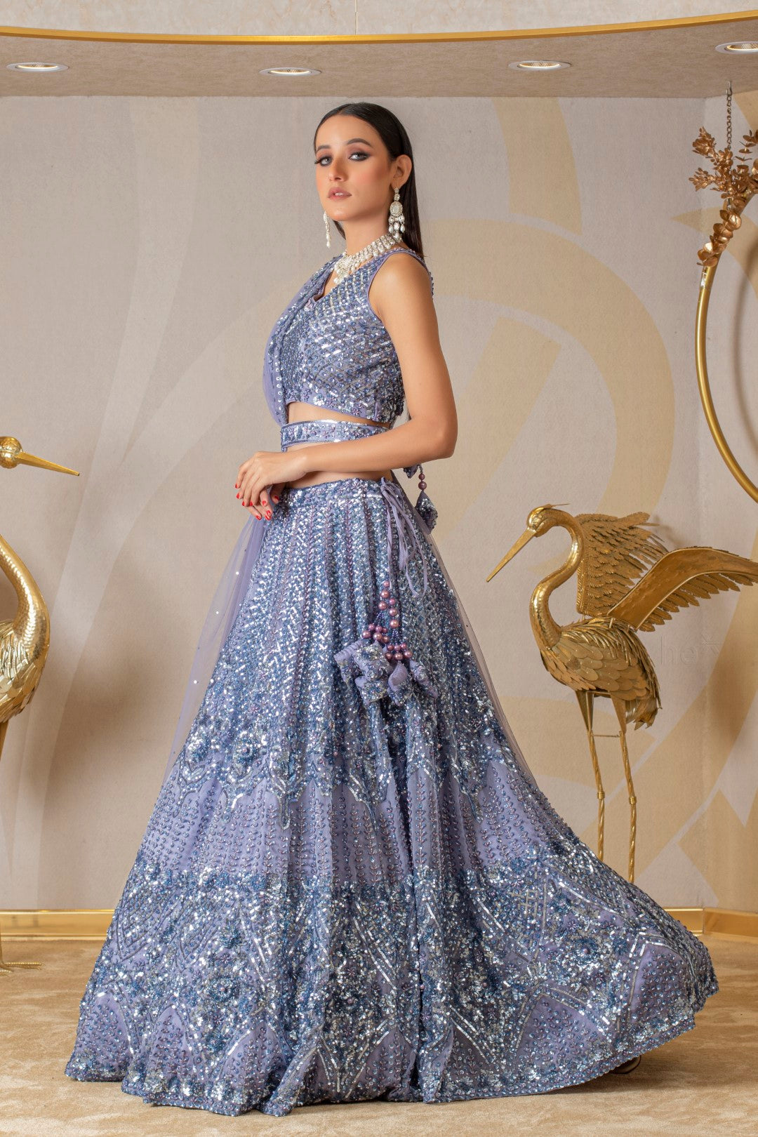A magnificent lehnga choli is deliciously rendered in lilac hues featuring stones, sequins, and beads on organza. Lavishly scattered embellishments create this illuminating outfit ideal for the wedding season. The look is completed with a net dupatta featuring a spread of beads.