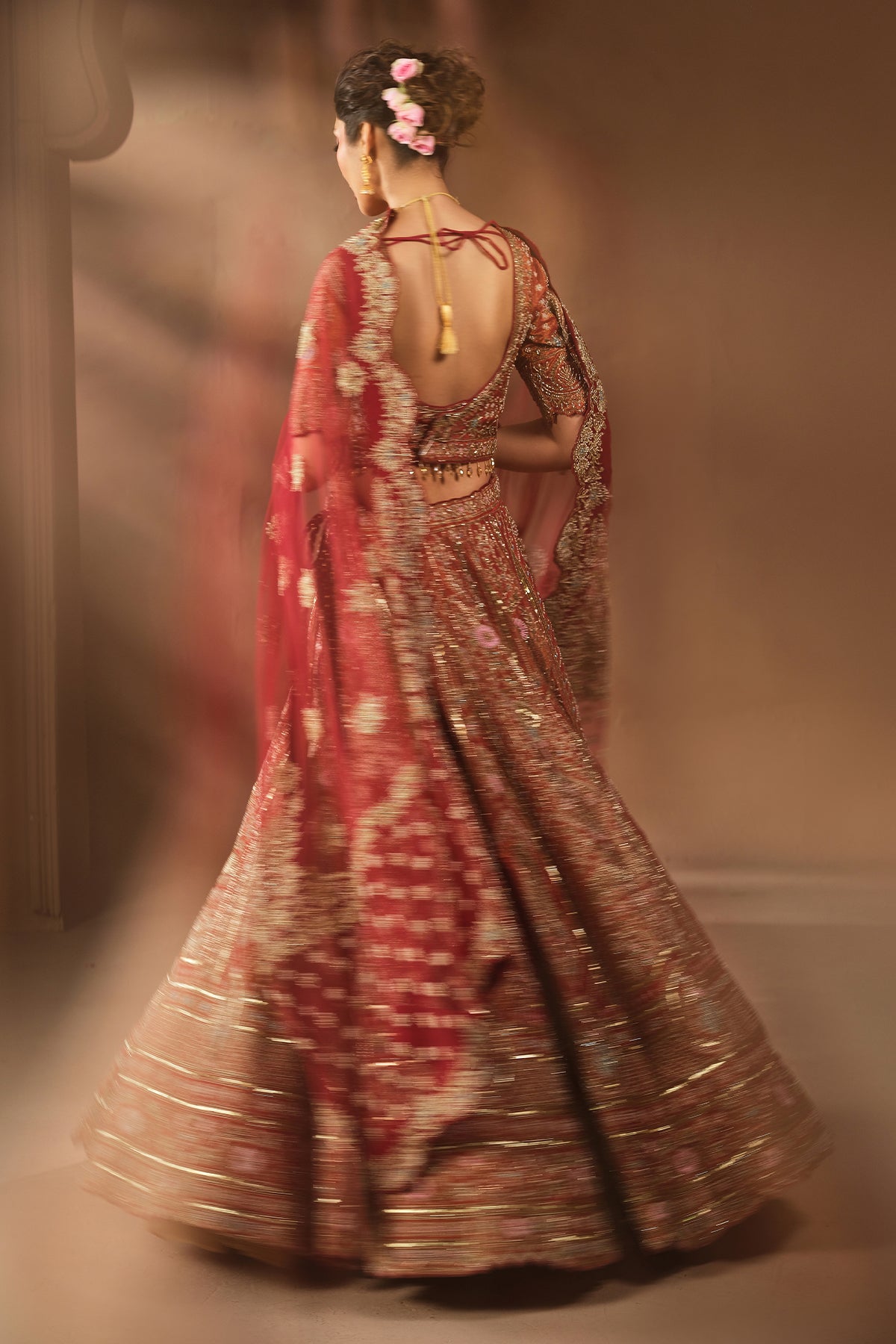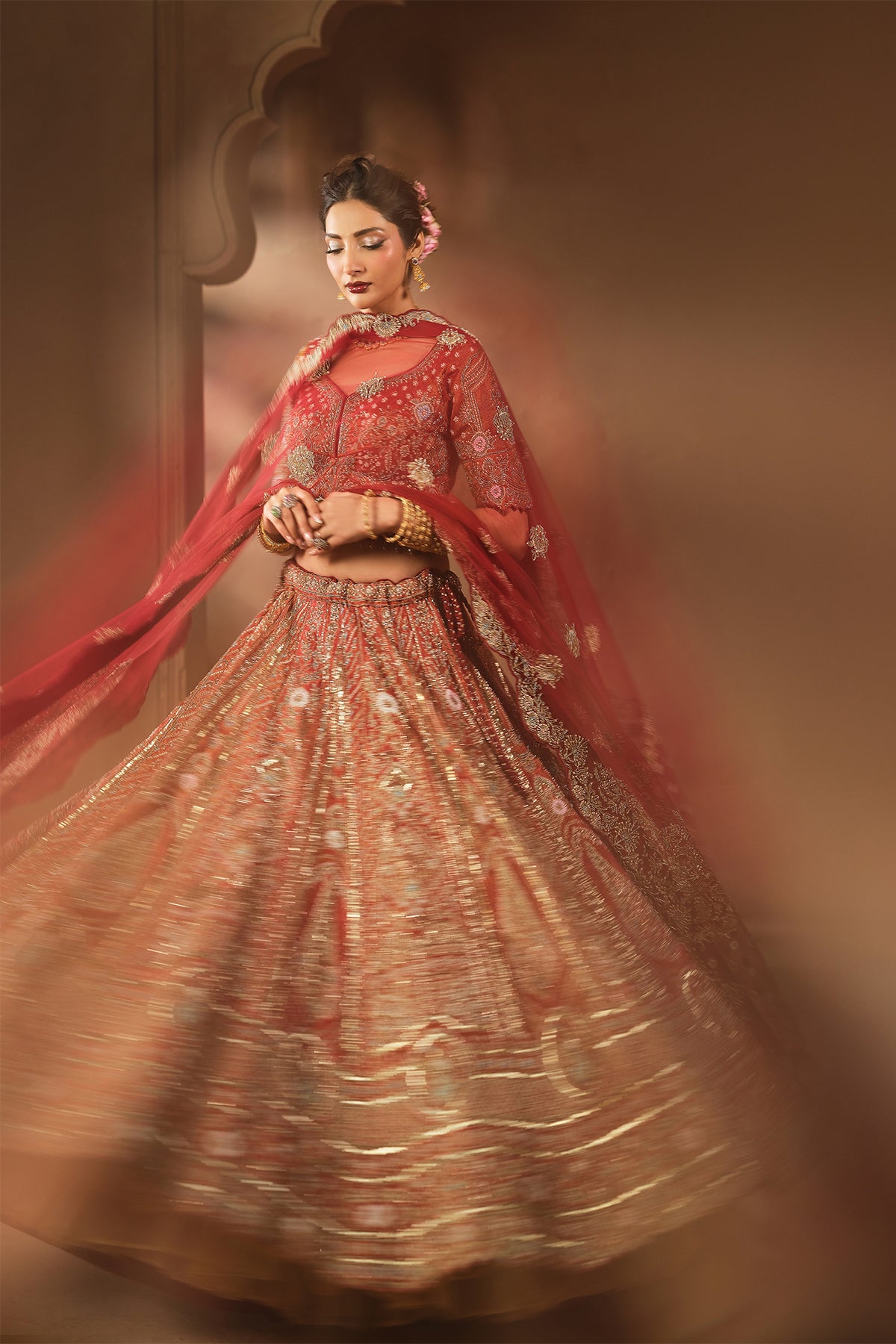 This bridal lehenga comes alive in rich red tones, layered with intricate sequin, cut dana, heavy moti work, and pearls. The blouse features dense handwork that mirrors the grandeur of the skirt, where ornate motifs and borders flow with a regal rhythm. The net dupatta drapes beautifully with scattered embellishment and scalloped edges, adding movement and softness. A look that captures traditional opulence with exquisite craftsmanship from every angle.