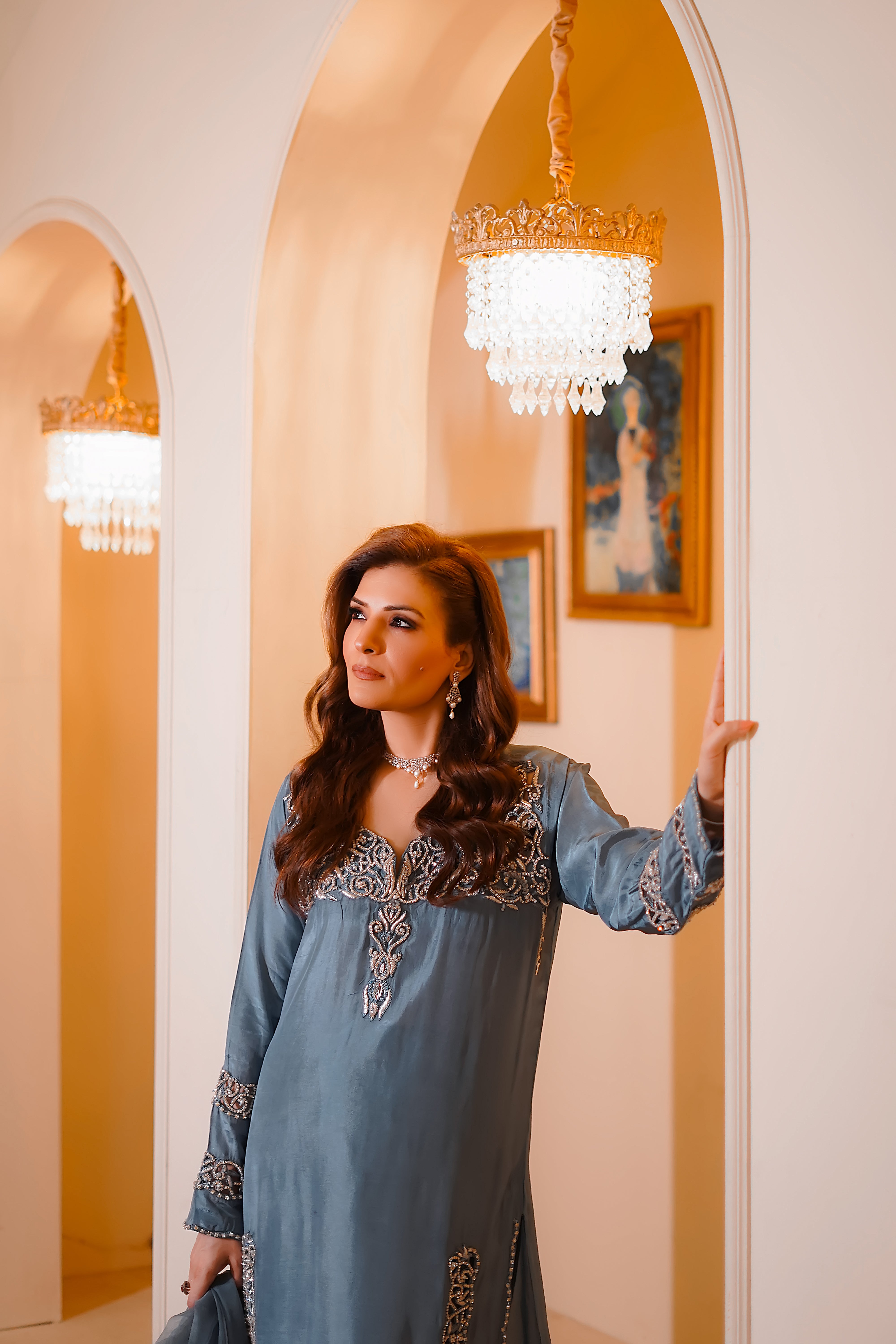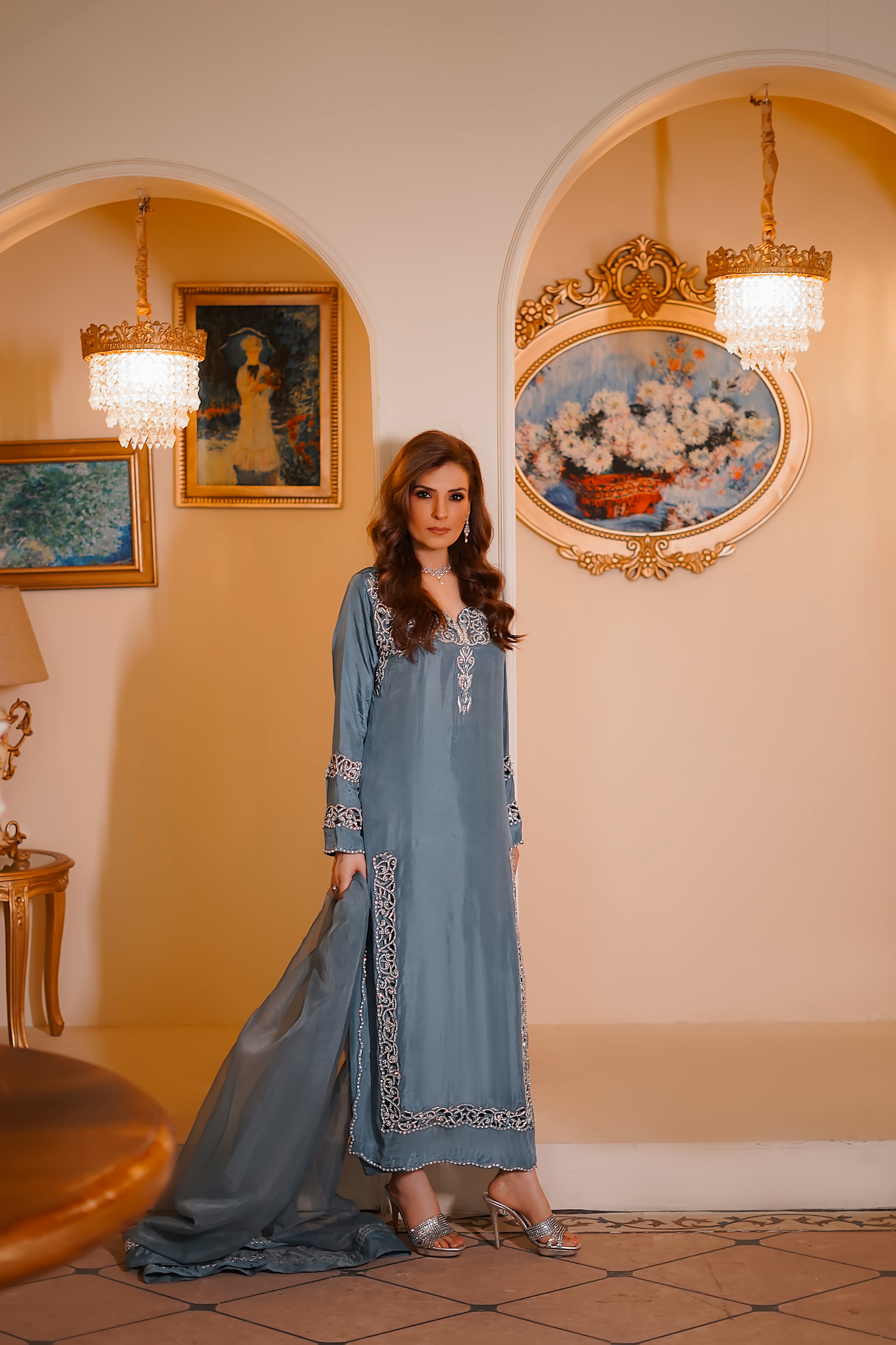 This elegant gray ensemble in luxurious tassel silk is adorned with intricate hand embellishments featuring shimmering stones, delicate pearls, luminous crystals, and traditional dabka work. The flowing silhouette is both graceful and refined, with detailed embroidery accentuating the neckline, sleeves, and borders. Paired with a soft, trailing dupatta, this outfit is perfect for festive occasions or formal celebrations.