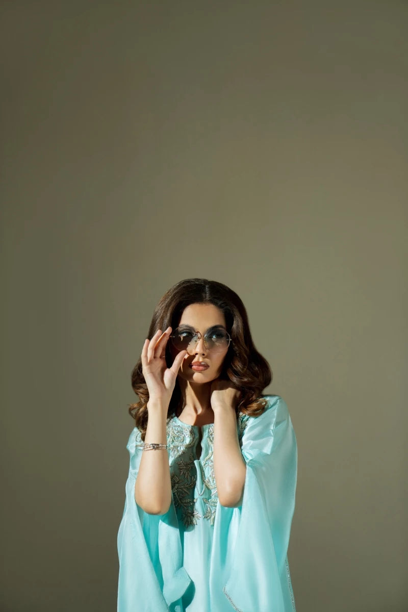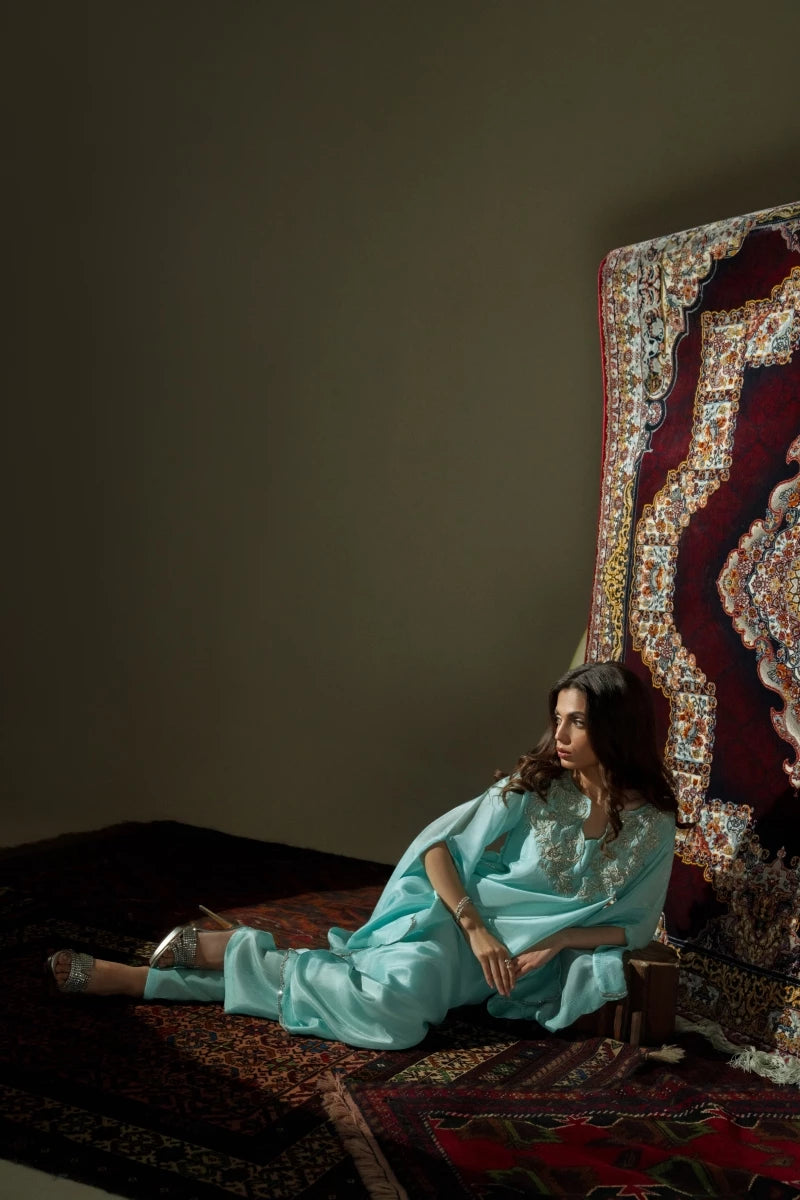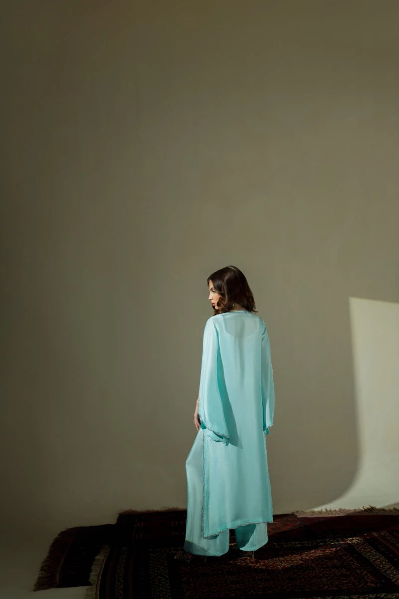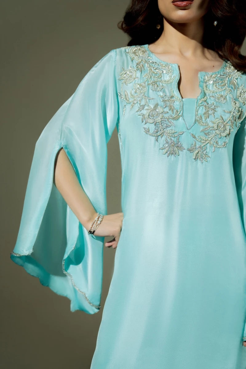A contemporary ice-blue long shirt featuring fluid bell sleeves, adorned with intricate zardozi, pearl, and beadwork along the neckline. Delicate hand-embellished scallops trace the length of the shirt, adding an artisanal touch. Paired effortlessly with wide-leg trousers for a refined and graceful silhouette.