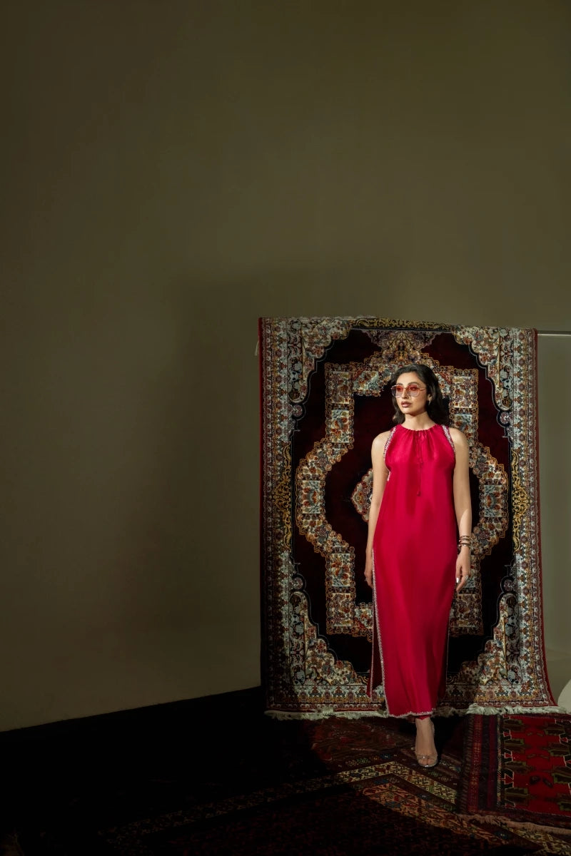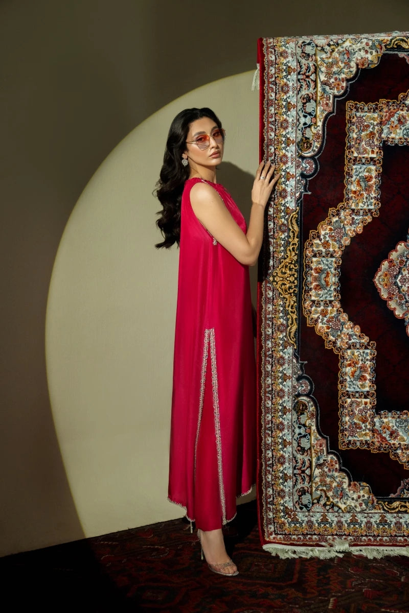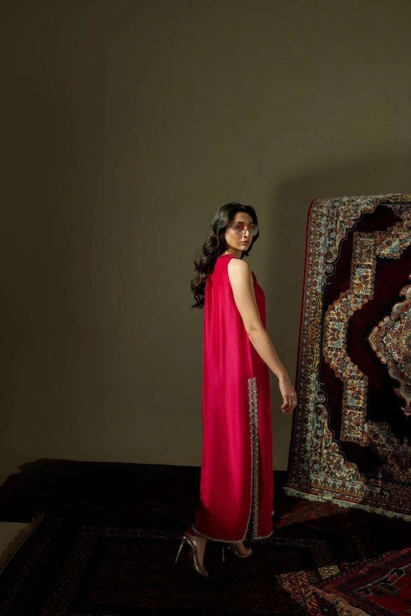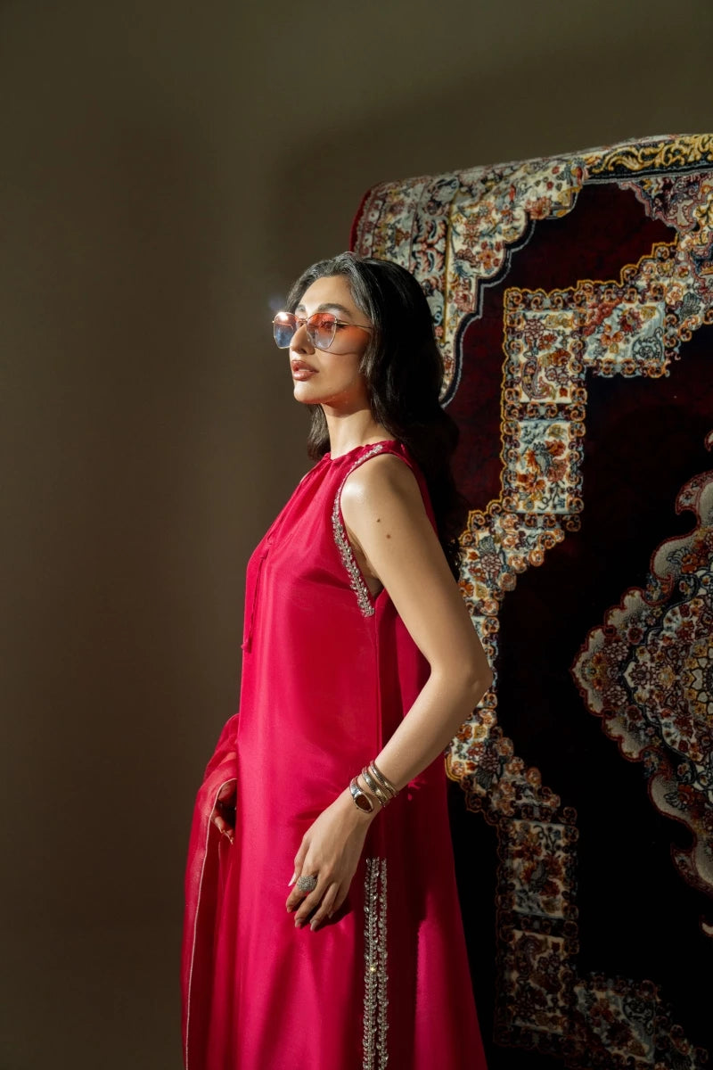 A graceful A-line silk shirt in striking fuchsia, featuring a ruched neckline and delicate hand-embellished crystal work. Paired with a flowing 3-yard organza dupatta and tailored straight-leg silk trousers for a refined look.